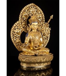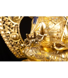 Padmasambhav is represented seated on a lotus asana with the legs locked, the right hand holding the vajra and left, lying in his lap, the patra. He holds his special symbol, the khatvanga pressed against his breast with the left arm.